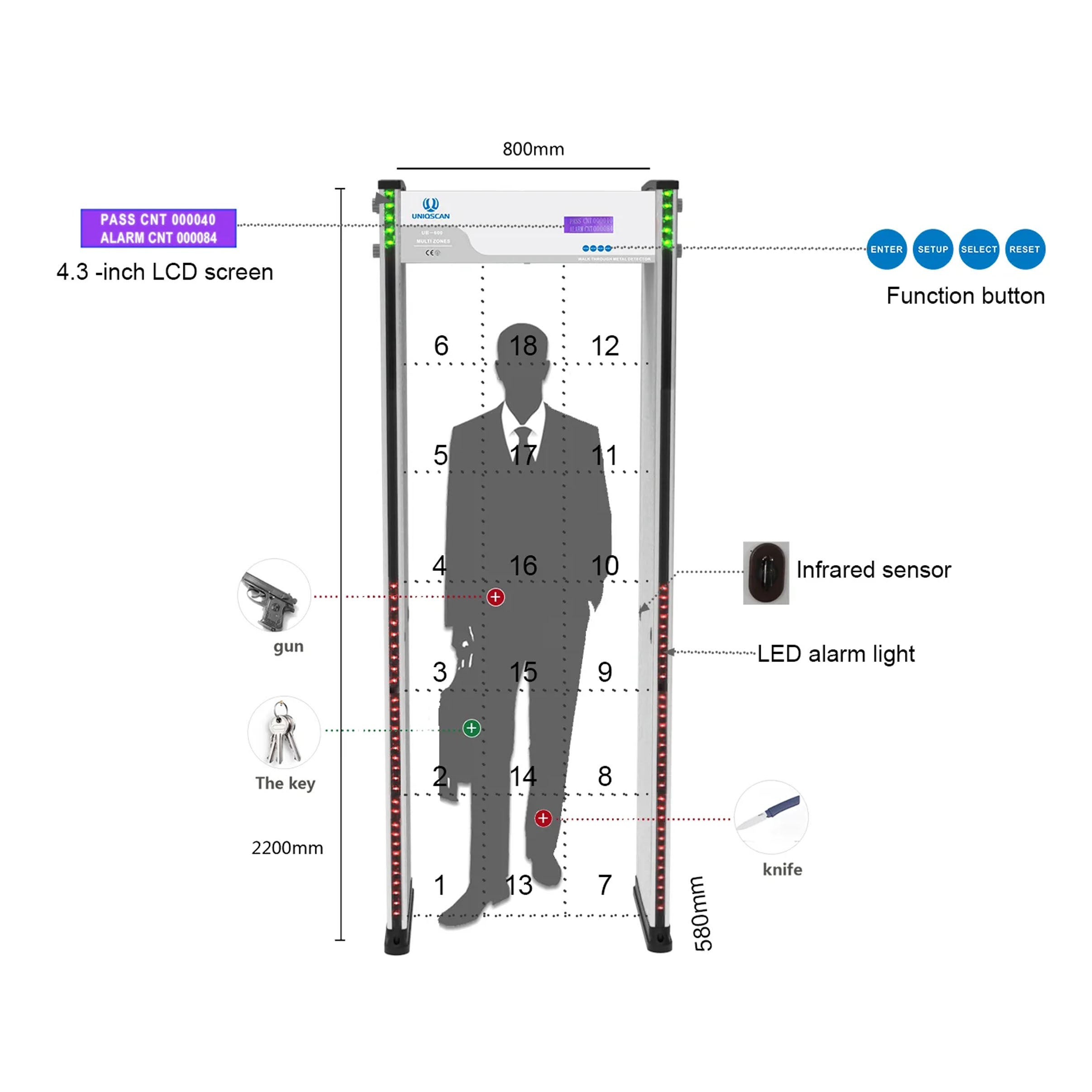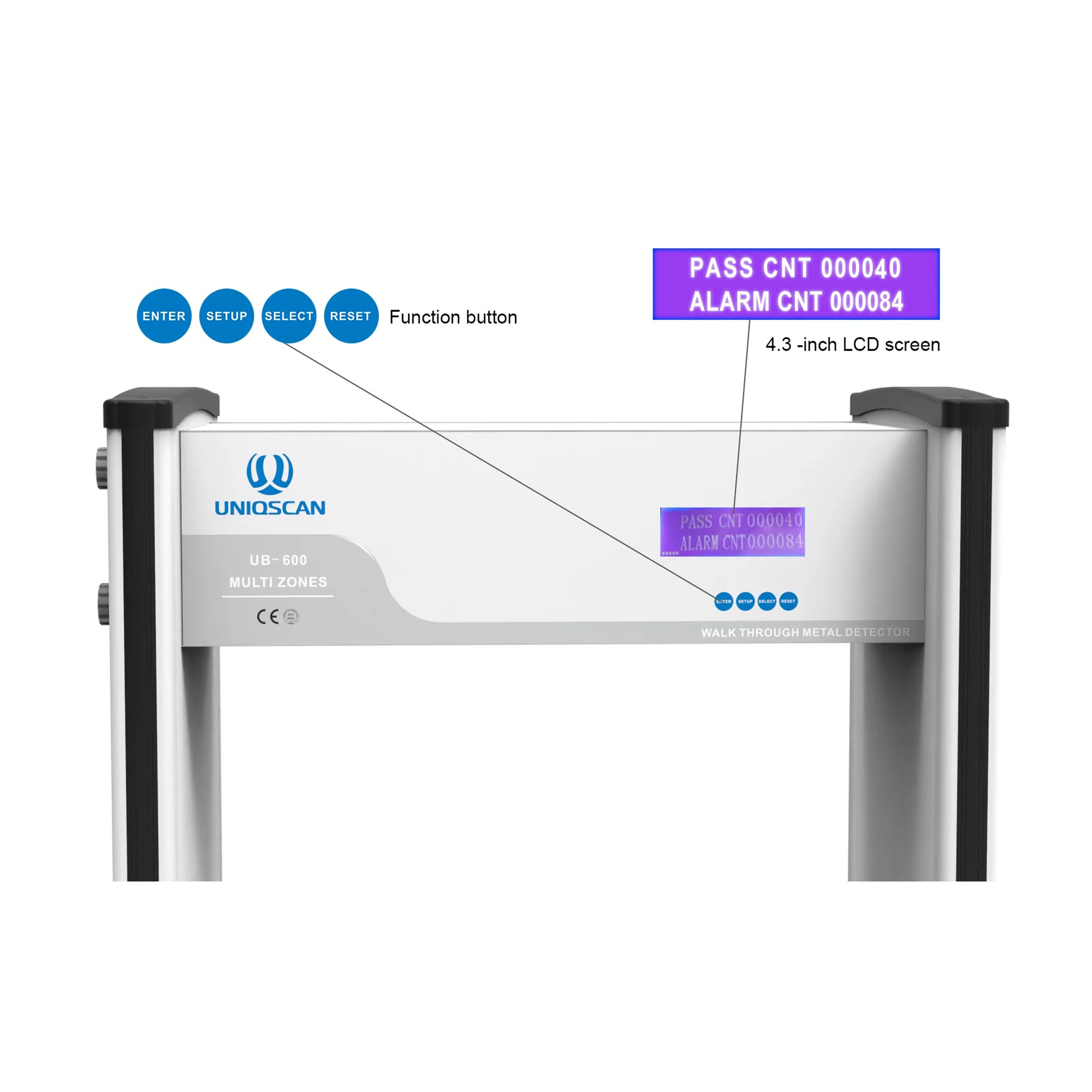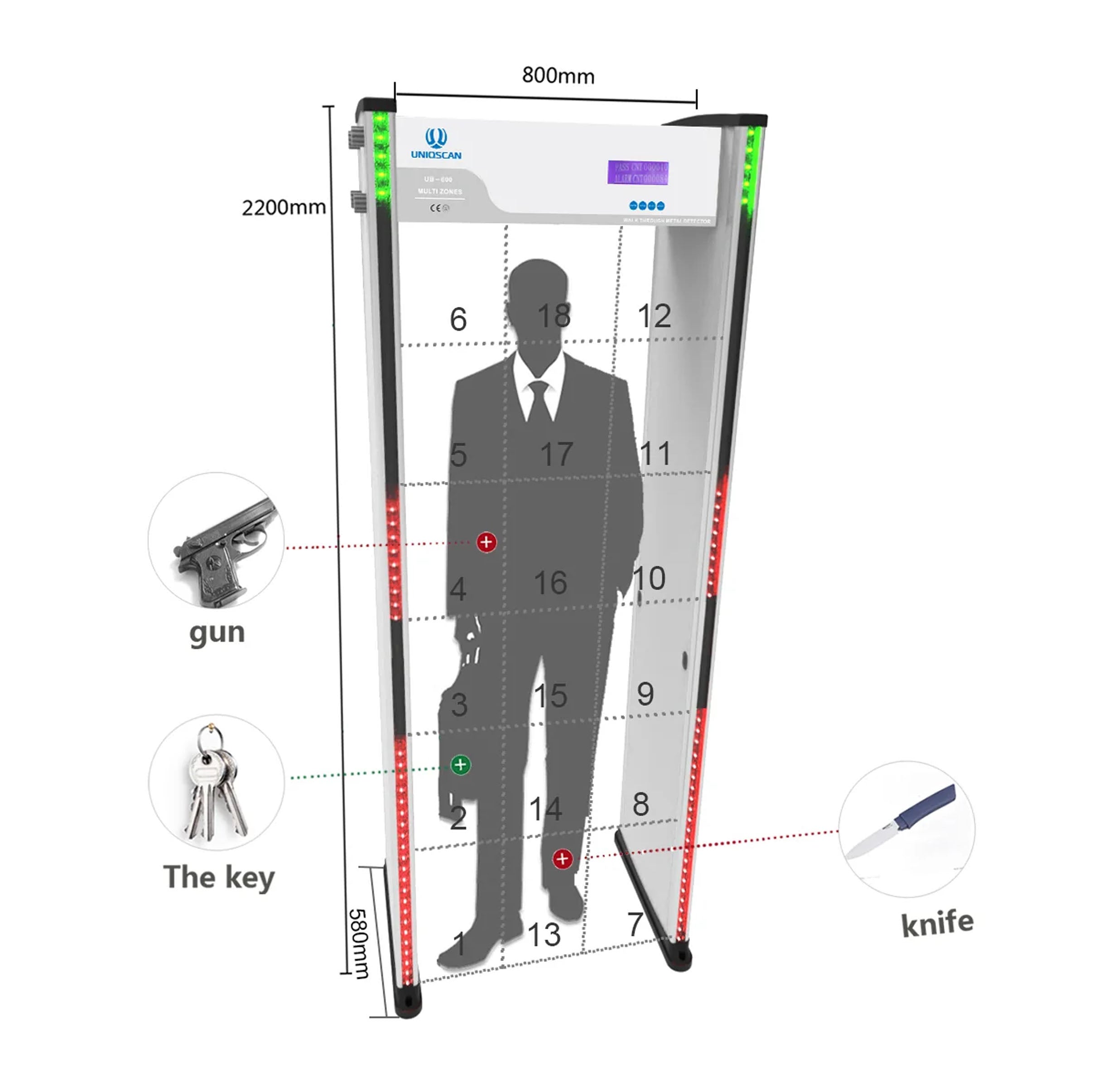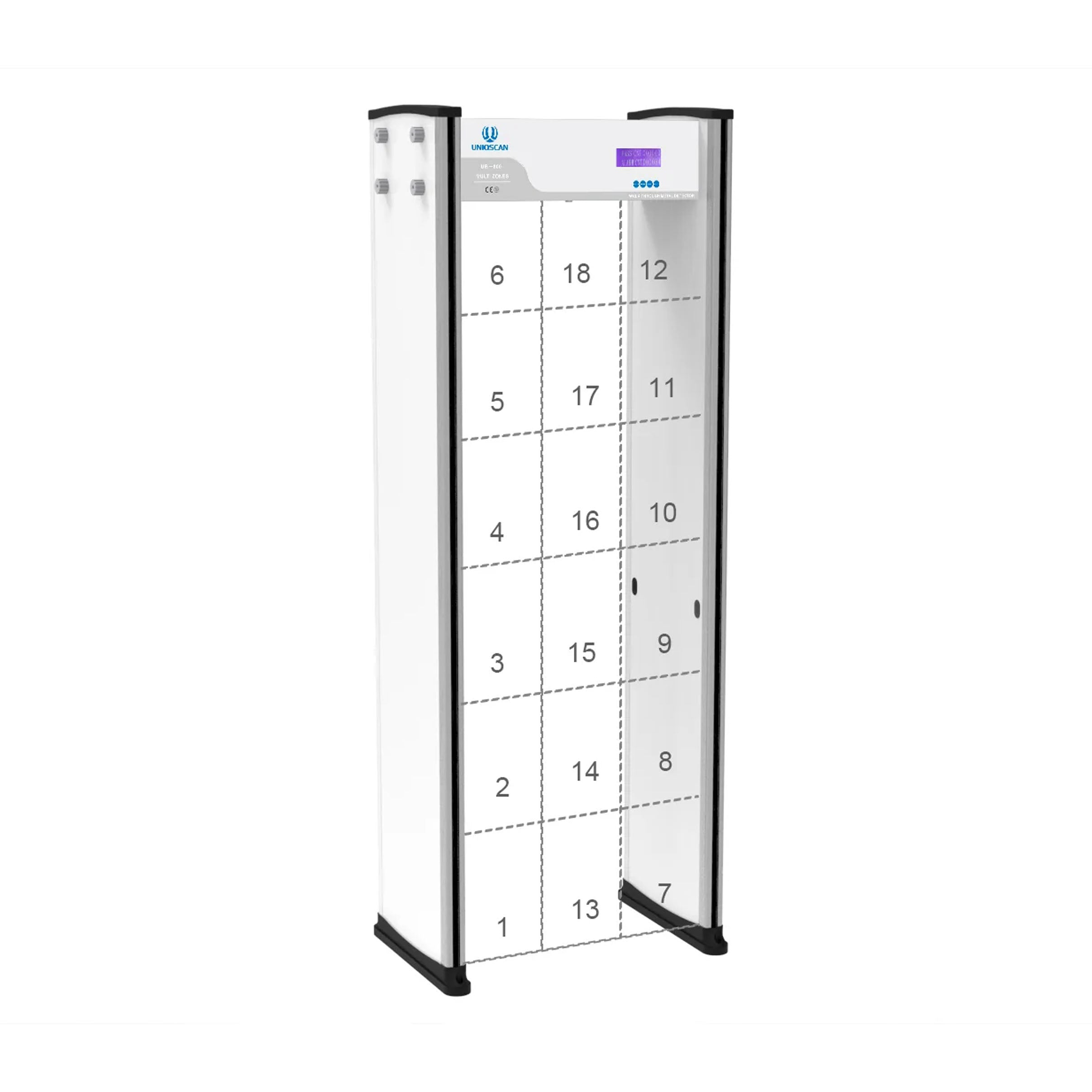 Cổng dò kim loại UNIQSCAN UB600 là thiết bị dò tìm kim loại đa năng với 18 vùng phát hiện và khả năng điều chỉnh độ nhạy, giúp sản phẩm được ứng dụng rộng rãi tại sân bay, ga tàu, trung tâm thương mại và nhiều khu vực kiểm tra an ninh khác. Thiết bị sử dụng trường điện từ để phát hiện kim loại trong cơ thể người qua bộ phát tín hiệu tần số cao, bộ thu tín hiệu và cảm biến hồng ngoại. Với khả năng cảnh báo bằng âm thanh và đèn LED, UB600 giúp nâng cao hiệu quả kiểm tra an ninh trong thời gian ngắn.