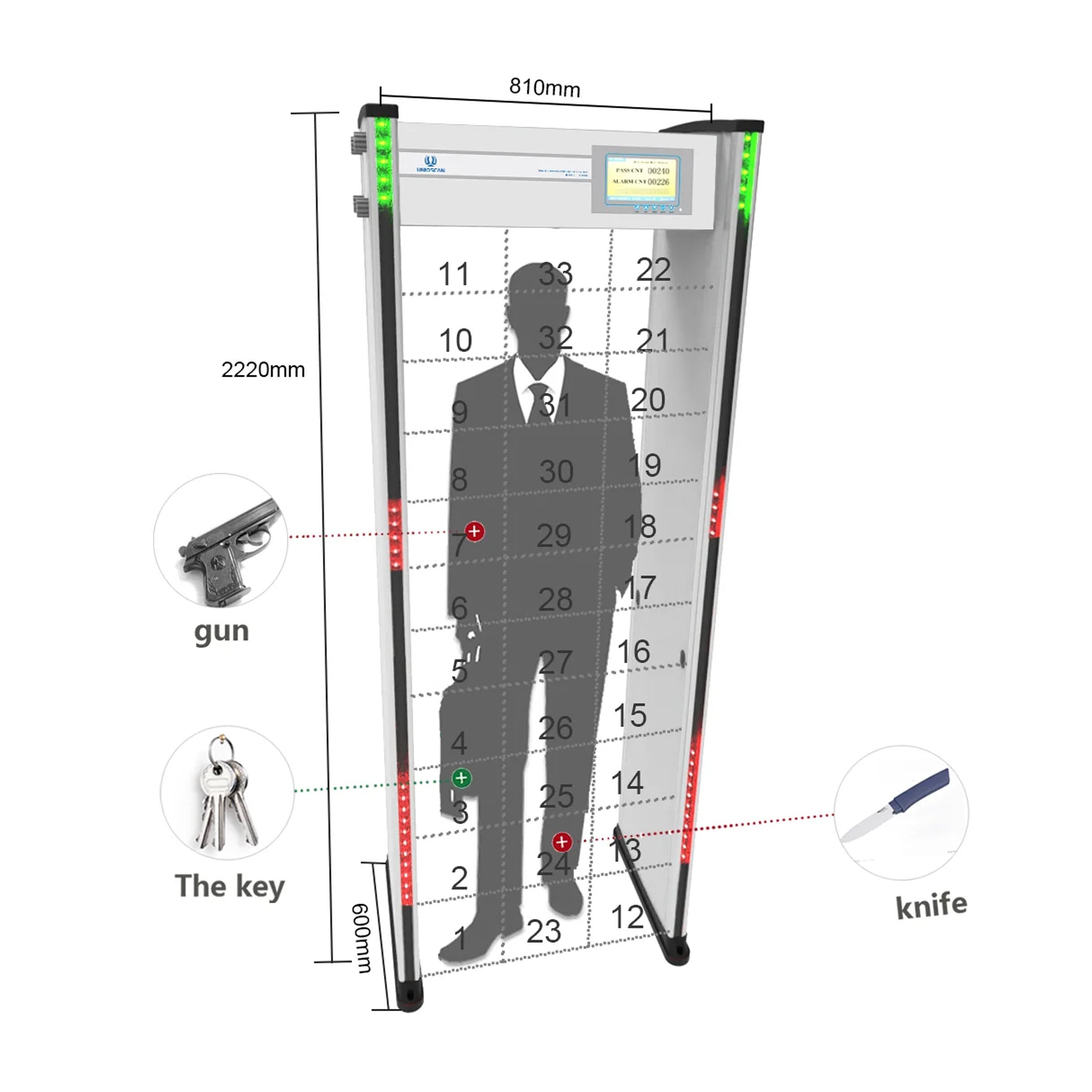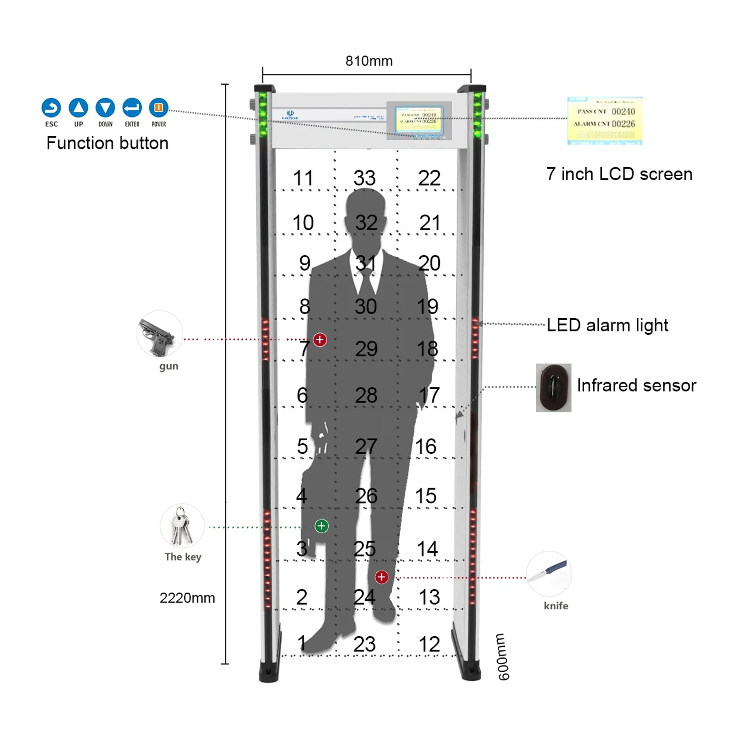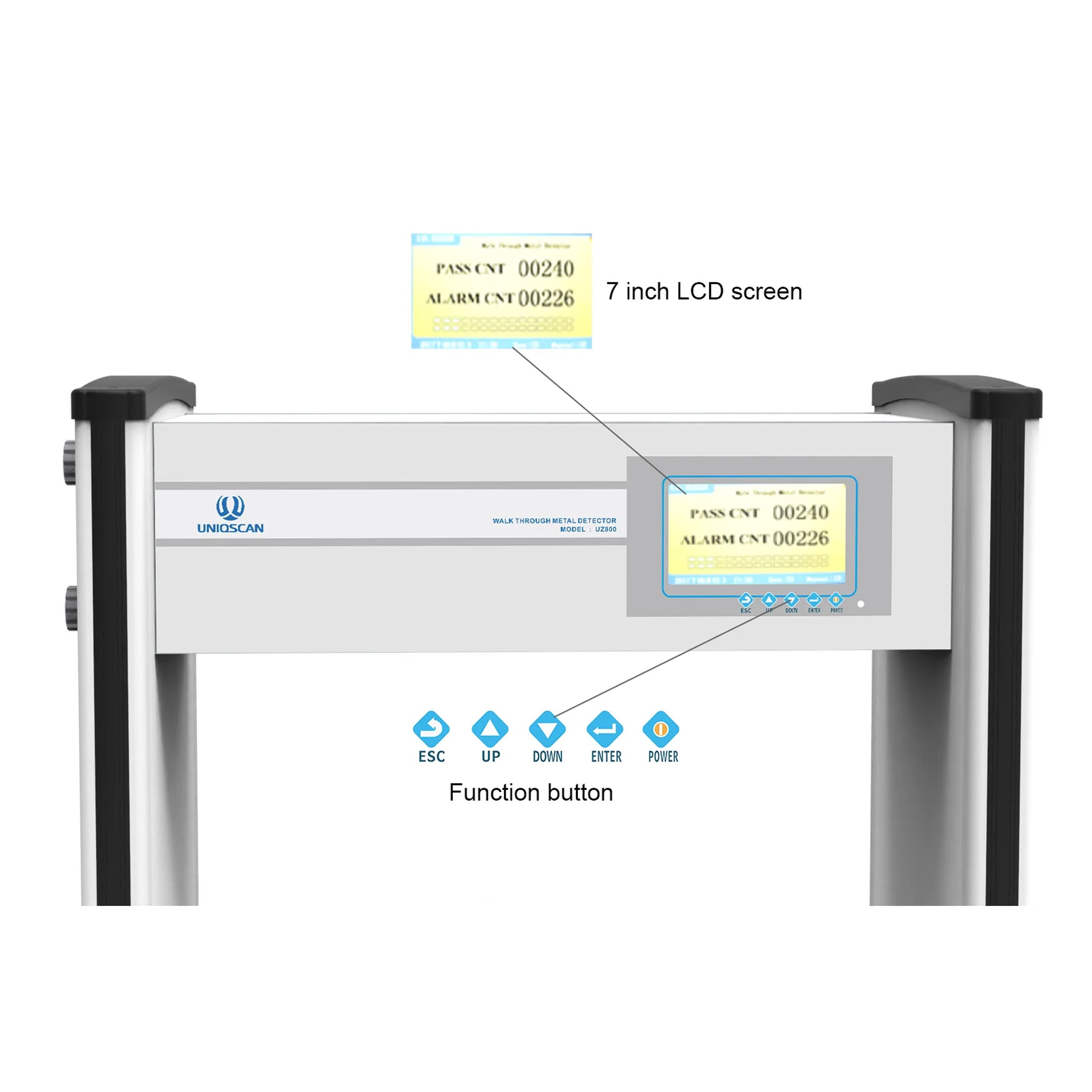 Cổng dò kim loại UNIQSCAN UZ800 là thiết bị kiểm soát an ninh tiên tiến, được trang bị 33 đến 45 vùng dò kim loại với khả năng phát hiện chính xác các vật thể nhỏ nhất như đồng xu một nhân dân tệ. Với màn hình màu LCD 7 inch, độ nhạy có thể tùy chỉnh theo từng vùng và khả năng chống nhiễu mạnh mẽ, UZ800 là lựa chọn lý tưởng cho các địa điểm yêu cầu kiểm tra an ninh nghiêm ngặt như sân bay, nhà ga, bệnh viện, trường học, và các khu vực công cộng khác.